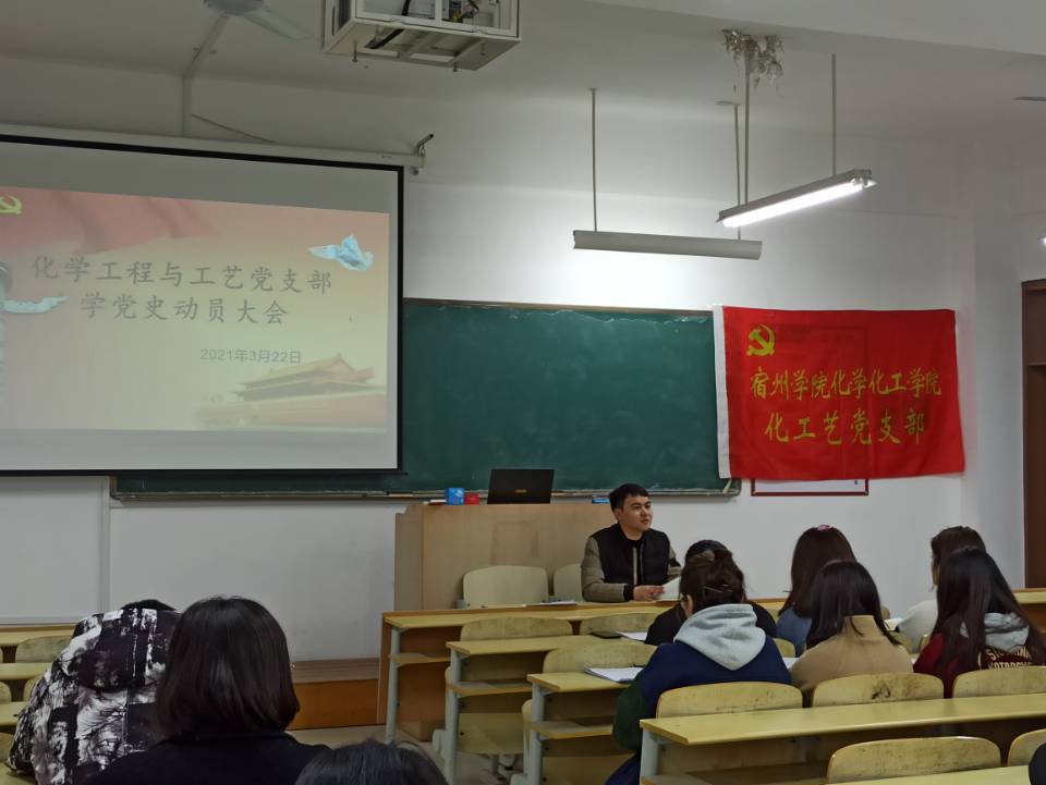 2021年3月22日,化学工程与工艺党支部全体党员在逸夫楼B310教室开展党史学习教育动员会暨主题党课活动,会议由支部书记卞振涛主持。