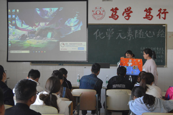 活动开始,主持人介绍评委并详细介绍比赛相关规则,活动现场,参赛选手集思广益,运用他们的奇思妙想将一个个化学元素赋予新的涵义并以此做出了一幅幅意义非凡、细腻独到的手绘。使得一个个化学元素成为了一个故事,一个词语,亦或者一种纪念!每一个参赛选手都表现出了他们自己的想法,把平时我们时时相伴的化学变得生动有趣。