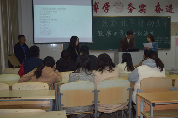 为了能够让同学们更好的认识化学,了解化学普及现实生活中的化学常识,提高大学生综合素质,拓展大学生视野,丰富大学生生活。我院于11月24日晚在东区实验楼A412举办玩翻化学小知识决赛,本活动是经过各个二级学院选拔的同学进入本次决赛。
