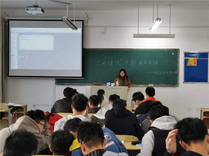 2019年11月24日,下午三点,在逸夫楼b208教室开展了“我校评估工作及学风建设班会”。参加本次班会的有成员:辅导员卞老师和18应用化学二班全体成员,班会由团支书周心茹主持。