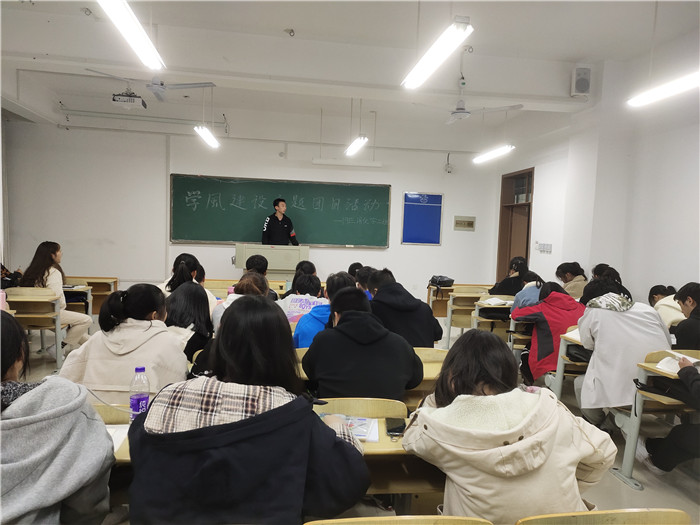 学习是人的本能,作为当代大学生,学习仍是我们的首要任务。为营造良好学习氛围,建设优良学习风气,促进班集体成员间相互学习、相互进步。2019年11月22日,星期五晚上7:00,我校19级应用化学二班在逸夫楼B206举行“学风建设”主题团日交流会活动。活动由班级负责人主持,19级应用化学二班全体成员参与。