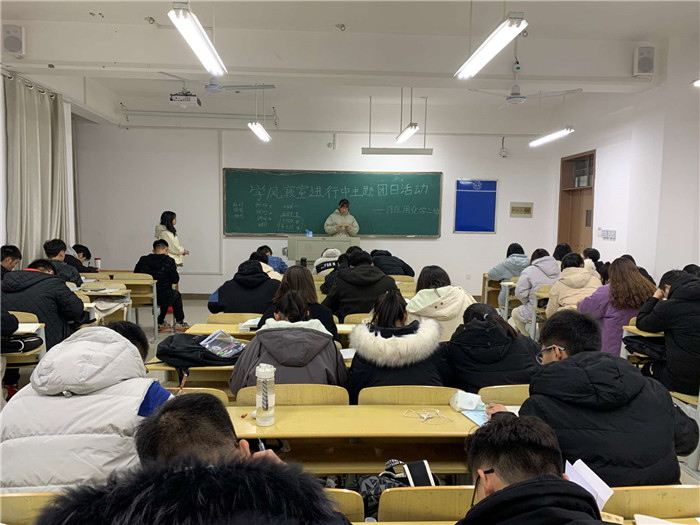 为了更好地提升寝室学风,营造寝室良好的学习氛围,培养学生学习习惯和团结合作、善于交流的能力。2019年12月22日下午19:00,我校19级应用化学二班在逸夫楼b206举办“学风寝室进行中”主题团日活动。19级应用化学二班全体学生参加。