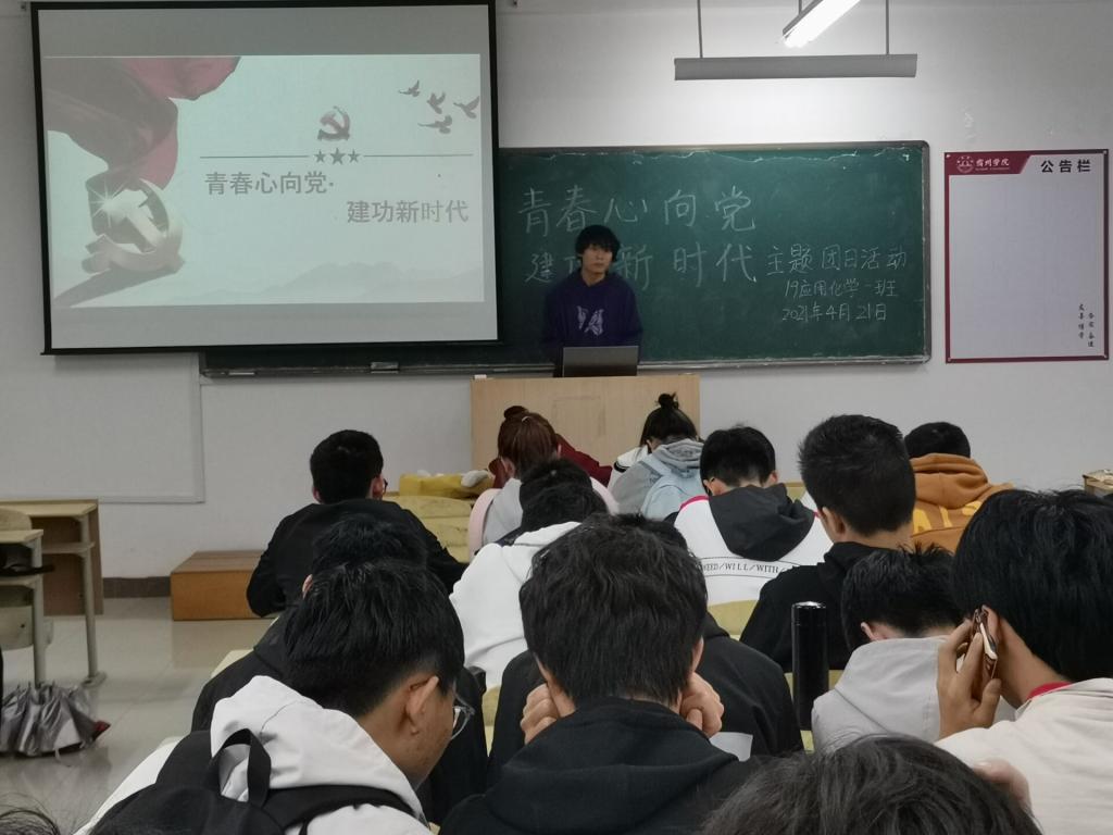3 月 23 日是中国共产党百年华诞倒计时 100 天,为庆祝中国共产党建党100周年,2021年4月21日上午10点,19应用化学一班在逸夫教学楼B310开展“青春心向党·建功新时 代”主题团日活动,团日活动由团支书组织开展,全体19应用化学一班同学参加。