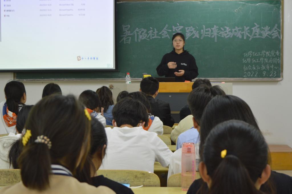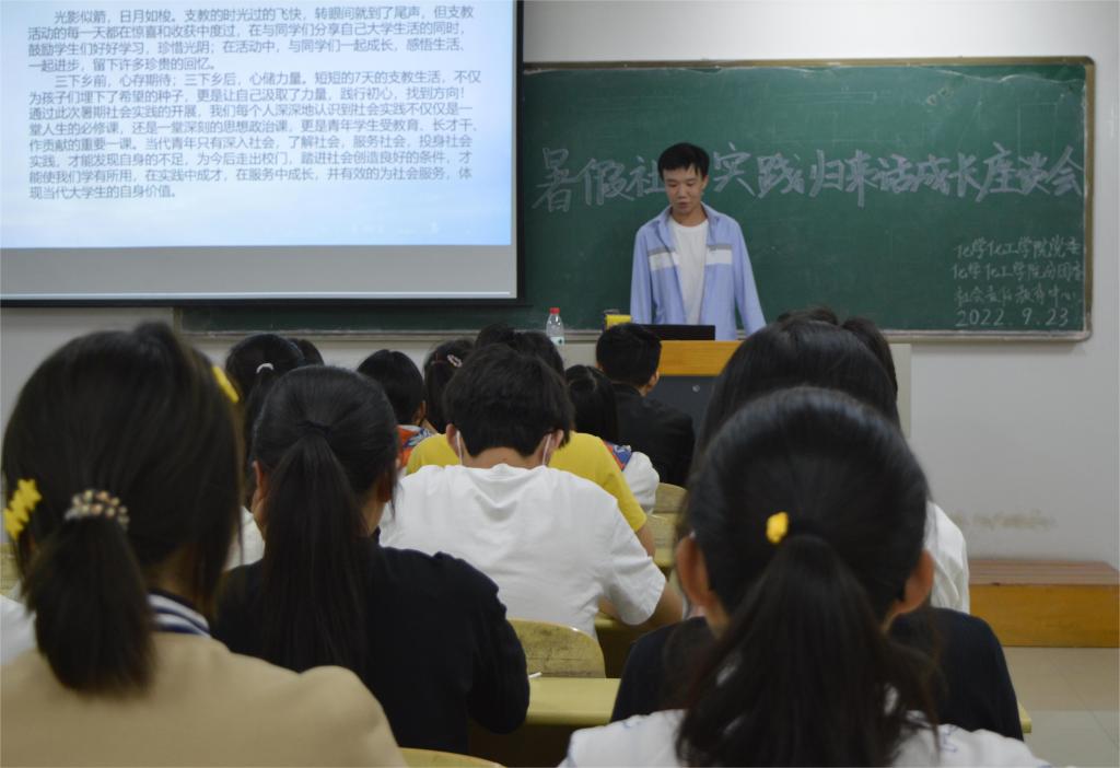 实践团队的代表们分别介绍了各自团队的特色活动,结合PPT与视频资料讲述了他们在实践生活中收获的成长与感动。星火传承,共同抗疫。皖北青年团积极参与乡镇疫情防控工作、社区服务实践活动,协助医护人员做好检查健康码、测量体温、人员信息登记,用自己的实际行动守护着家园;建设美丽乡村,贡献青春力量。民生调查团采取“点对点”走村入户的方式,详细了解村民的生活情况,开展政策宣传活动,加深了村民对党的惠民、利民、改革发展等一系列方针政策的了解,提高了村民对建设美丽幸福新农村的信心;了解红色文化,传承红色精神。红色宿愿专行队参观了红色文化博物馆,进入学校,宣传红色文化。美丽中国实践团远离城市喧嚣,深入农村,在炊烟袅袅的农村,调研最淳朴的农民生活情况,了解当地的风土人情。他们多个角度展现化工学子投身基层建设的青春风采。体现了化工学子在实践中受教育、长才干、做贡献,以踔厉奋发的精神姿态迎接党的二十大胜利召开的良好精神风貌。