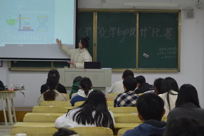 “化学LOGO设计”大赛活动中,选手们依次上场,以PPT的形式将自己的作品展现出来,选手们准备充分,详细介绍了每一个元素代表的理念,把自己对于化学的热情全面地展现出来。每一张富有创意的logo图标,背后都凝聚着设计者的智慧,充分展现了同学们的创新设计理念 有助于学生加强对于化学知识的理解。