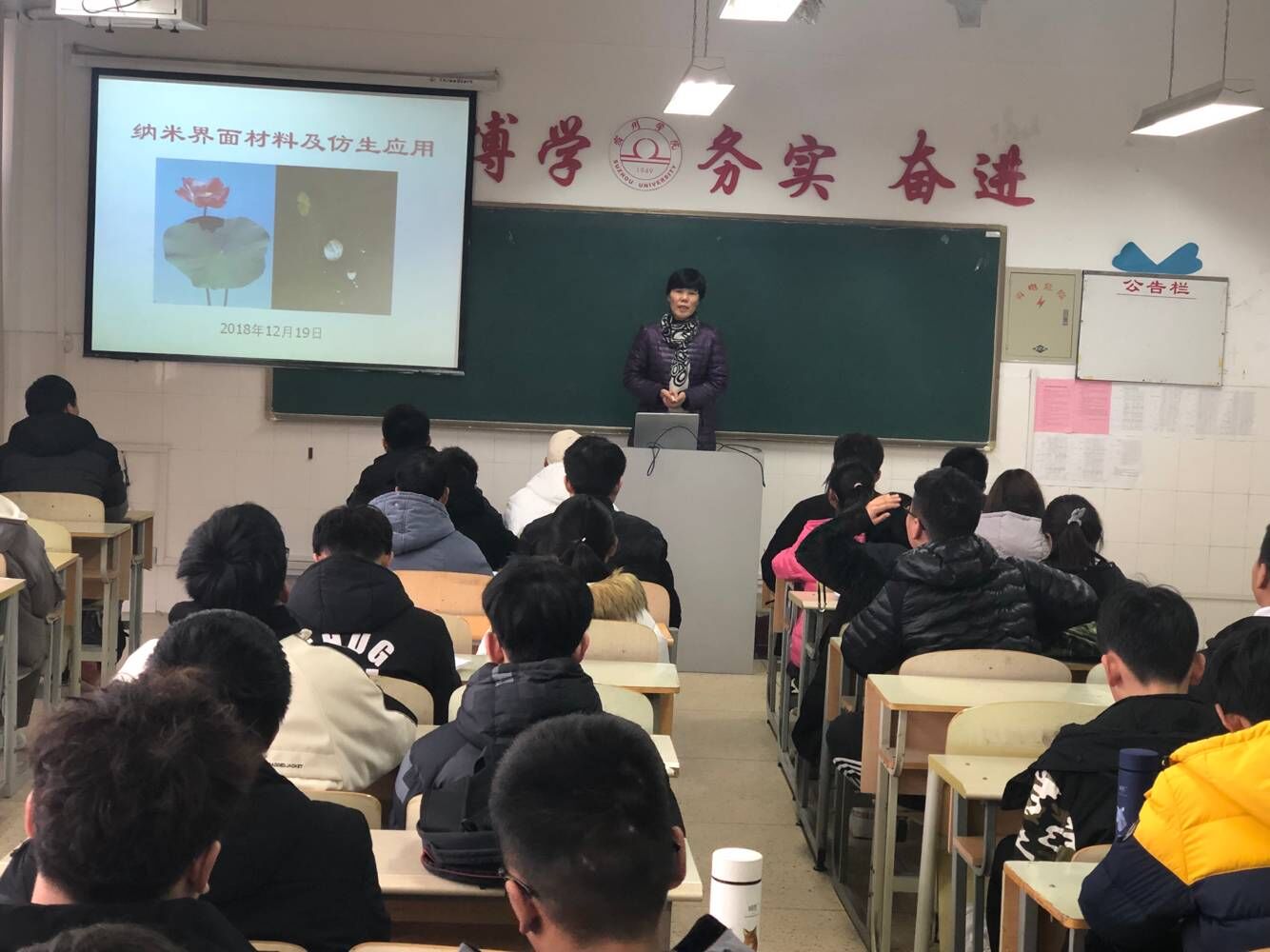 2018年12日19上午,张莉教授在实验楼A412做了题为“纳米界面材料及仿生应用”的精彩报告,9778818威尼斯部分学生听取了讲座。