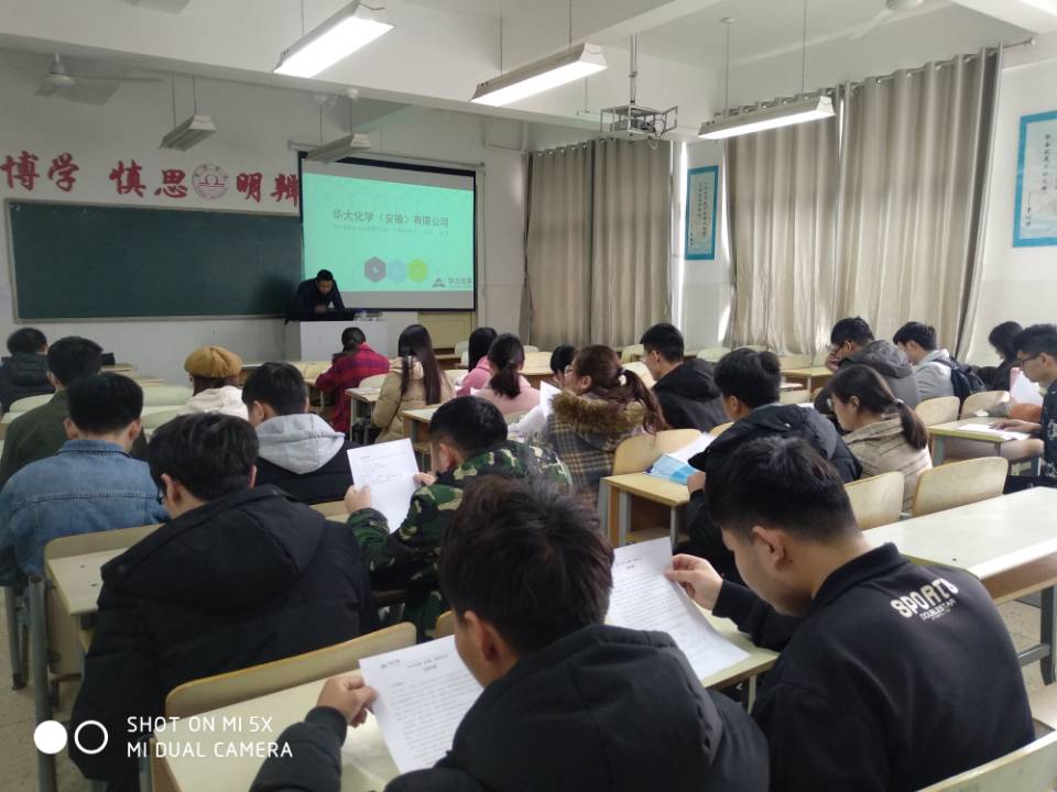 华大化学(安徽)有限公司和美迪西生物医药两家公司负责人分别向大家展示了各自企业的概况和行业发展前景等,并强调了其公司的规范性,以及对员工自身成长的提升作用,同时也介绍了公司实习生的福利待遇及管理要求,并为学生们答疑解惑,全面介绍工作的内容,工作环境及晋升机制,并鼓励学生要以乐观向上的心态认真工作,踏踏实实的做自己的职业。