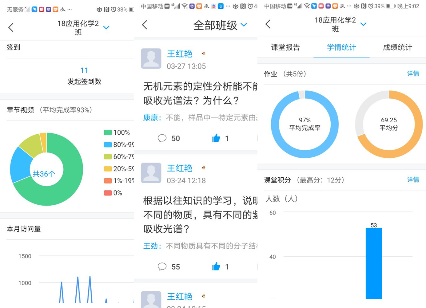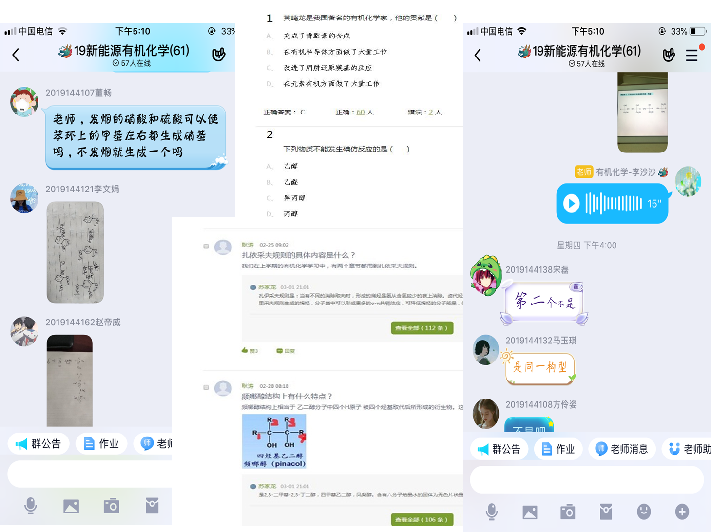 在教学检查中,各位教师发来的教学统计实况数据和图表,以及学习讨论区文字记录,可以看出各位教师重视课前课后辅导、综合开展各种教学方式,取得了较好的教学效果。教师能认真布置课后作业,有填空、问答等方式不一,批改作业也及时;学生答题方式也各不相同,有的写在纸上拍照上传、有的语音回答,绝大部分学生能认真答题。课程讨论区不如作业区热度高,这有待提 升学生主动学习的能动性。