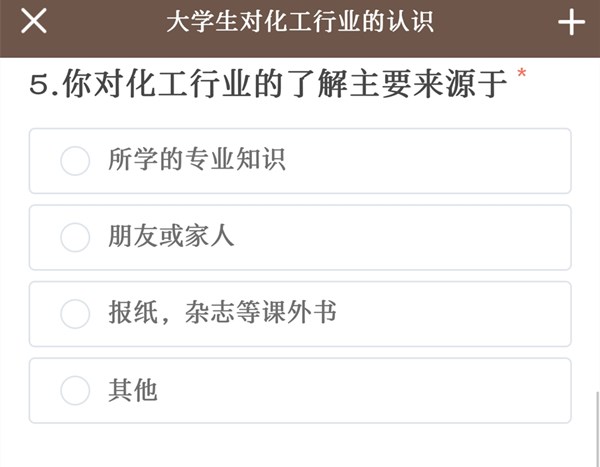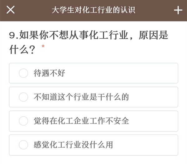 队员们首先制作了问卷,随后通过一些社交软件对大学生进行问卷的发放,对自己的朋友进行相关内容的访谈,更直观的体现出大学生对化工行业的认识情况。并且与曾在化工厂工作过的学长学姐们取得联系,通过对他们的访谈进一步了解化工厂工作的实际情况,拓展大学生对化工厂的实际认识,为自身将来发展做更好地规划。学长学姐们通过对化工厂的实际认知情况,对未来有意向参与化工业工作的学生们提出良好建议。