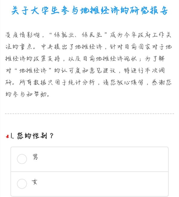 得到调研任务后,团队迅速进行了会议探讨工作细节,分配工作任务,就网上调研问题与困难进行探讨与解决。根据当下疫情现状进行活动范围约束,强调以自身健康安全为第一位开展活动。确定前期资料收集为网上调研问卷的形式,随后讨论问卷问题。经过一段时间的宣传与资料收集,得到了几十份问卷资料。同学们就是否参与地摊经济,参与时间地点,参与动机,建议收获等进行了开放的回答。