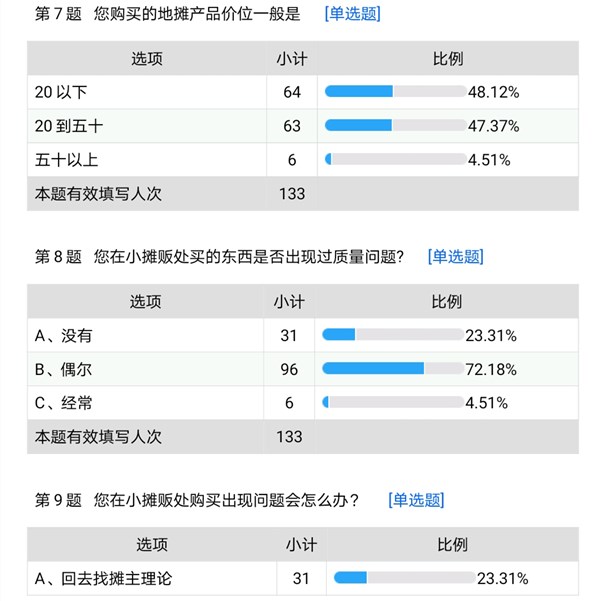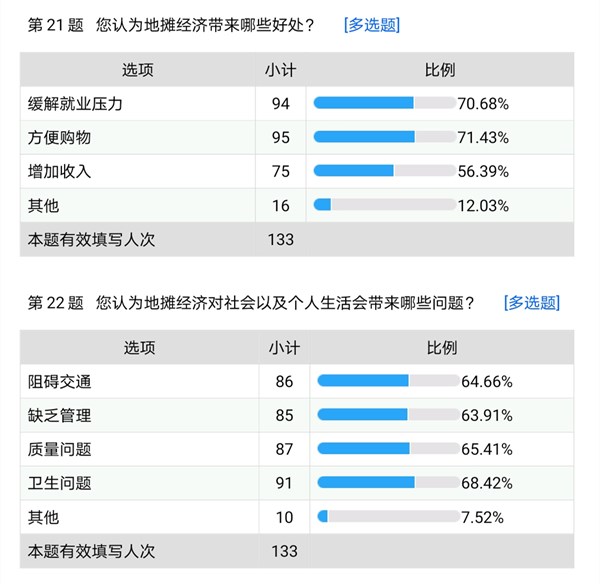此次云调研采取随机调研的方式,以云端调研的方式,借用电子产品以及社交软件进行随机调研,在分析如今地摊经济发展情况的基础上展开调研,展现民众对地摊经济的实际感受,满意度以及对地摊经济的展望。在云端调研中,绝大多数人大力支持地摊经济的发展,并且表示地摊经济的发展可以有效带动经济复苏,有效缓解就业压力,一定程度上减轻家庭生活负担,可以加快促进城乡繁荣。在调研中我们发现,有相当一部分被调查者表示,有了地摊经济,才使得原本被城市光鲜亮丽所遮掩去了的烟火气息又回到了人民的生活之中,在高大上之中也平添了一份“地气”。