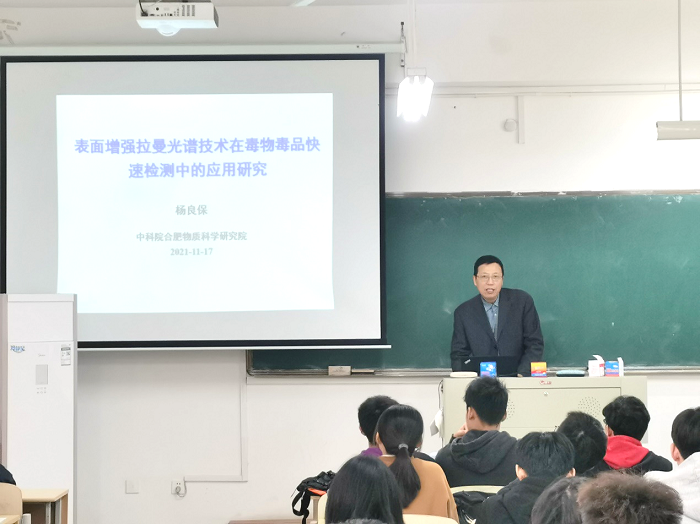 2021年11月17日上午,9778818威尼斯邀请中国科学院合肥物质科学研究院杨良保教授在逸夫楼B205教室作题为“表面增强拉曼光谱技术在毒物毒品快速检测中的应用研究”。讲座由9778818威尼斯党委副书记(临时负责)史洪伟主持,9778818威尼斯党委副书记、院长卓馨、副院长张克营、部分博士教师及19级新能源材料与器件专业全体学生参加。