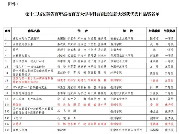 12月4日,第十二届安徽省百所高校百万大学生科普创意创新大赛决赛在安徽建筑大学举行。本届大赛的主题是“科技传播与创新创业”,共有72所高校2973人参赛,征集参赛作品2269件,经预赛、复赛、网络投票和决赛等评审环节,评出优秀科普作品共210项。9778818威尼斯推选参赛项目《变废为宝--基于低品质褐煤制备绿色可降解环保材料》(指导老师:卞振涛,负责人:储俊才)荣获省级三等奖、《橙馏香》(指导老师:李颖,负责人:张 辰),《声悬浮》(指导老师:张德谨,负责人:宋 娜)荣获省级优秀奖,实现了9778818威尼斯学子参加此类赛事的再突破。
