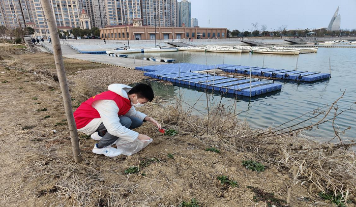 爱在行动,巡河护河。2022年1月5日至1月8日,我院21级应用化学2班丁博文同学身着红马甲,手拿垃圾袋在家乡龙子湖畔做巡河护河志愿服务活动,清理沿湖沿岸的白色垃圾,并协助工作人员对河面漂浮的垃圾进行打捞;1月9日至1月12日,在淮河沿岸向过往群众宣讲河湖保护重要意义,清理沿线岸边垃圾。1月13日至1月15日,在天河沿岸协力配合清理湖岸垃圾,积极引导群众投身河湖保护行动中。以实际行动向群众传递“爱水护湖人人有责,碧水蓝天共同保卫”的理念。