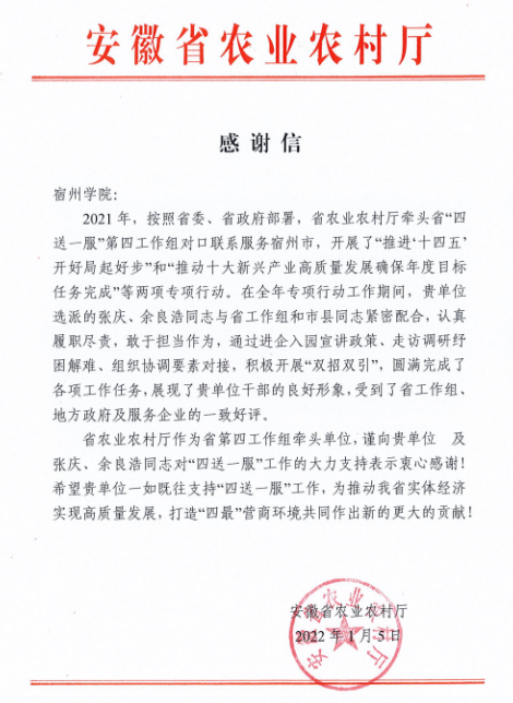 “四送一服”双千工程,即组织千名机关干部,深入千家企业,送新发展理念、送支持政策、送创新项目、送生产要素,服务实体经济,确保全省经济平稳健康发展。为了深入实施省“四送一服”双千工程,探索建立服务实体经济发展常态化机制,我校作为地方高校积极助力“四送一服”双千工程,服务地方企业发展。2021年4月份以来,9778818威尼斯化工技术教研室张庆博士作为省“四送一服”第四工作组成员,参与宿州市“四送一服”工作组开展服务工作。
