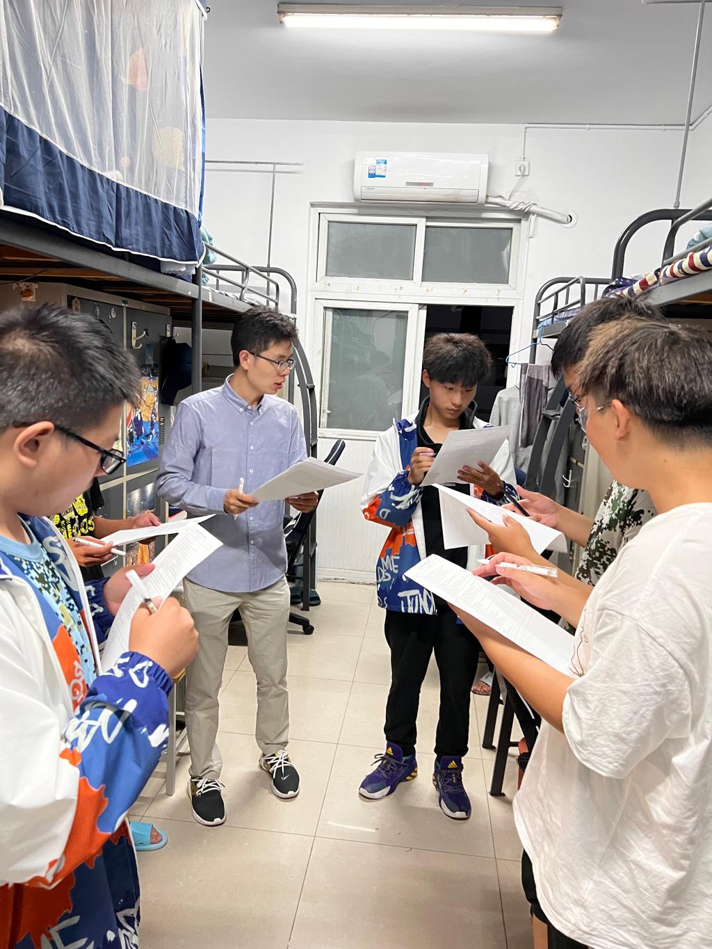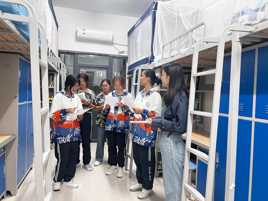 刘茜带领检查小组来到学生宿舍,按照军训内务检查规定和要求,对学生宿舍中生活用品的摆放,室内整洁清洁等进行逐项检查。同学们表现得积极热情、主动配合,对检查中发现的问题,师生一起整改落实。学生通过内务整理的学习,培养团结协作的集体精神,为今后快乐学习、健康成长奠定良好的基础。