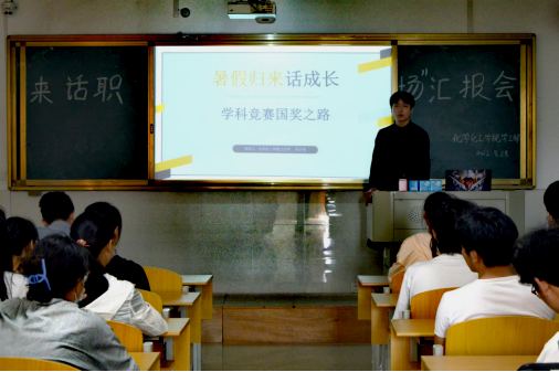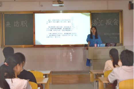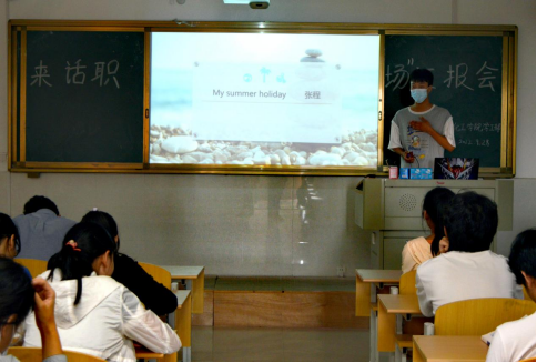 汇报会上,学院推荐的11名学生代表以PPT的形式与到场的同学们分享了个人实践经验和感悟,有的同学分享了自己利用暑期备战国赛,不仅学习了很多软件和知识,比赛的宝贵经历让自己更加了解自己的专业、行业和市场人才需求,并坚定地确立了自己的职业目标;有的同学在假期做起暑期兼职工作,体会了工作艰辛,体验了生活的酸甜苦辣和人情冷暖,对于自己职业发展有了新的认识和思考,更加坚定努力学习报效祖国的决心和信心。