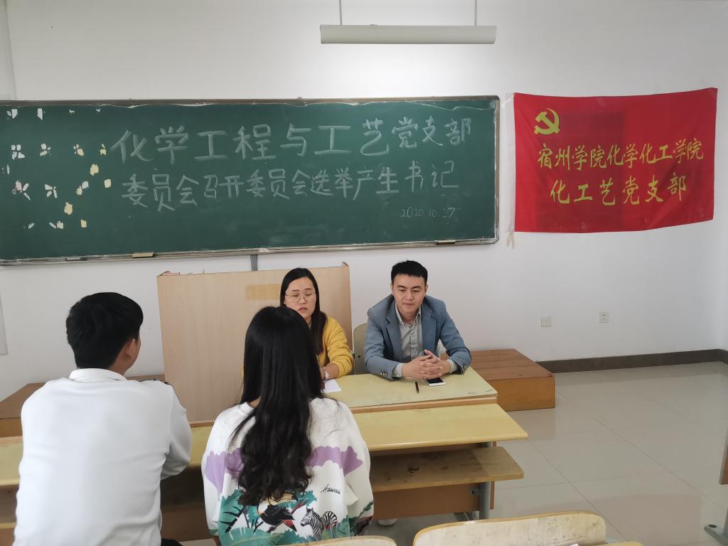2020年10月27日下午,化学工程与工艺党支部委员会进行换届选举工作,选举过程由李雪莲主持,并做了换届选举工作报告,全面总结了支部的活动开展、自身建设等情况。李雪莲同志宣读选举办法及候选人名单,经党支部委员的选举投票后。确定卞振涛同志为党支部书记。