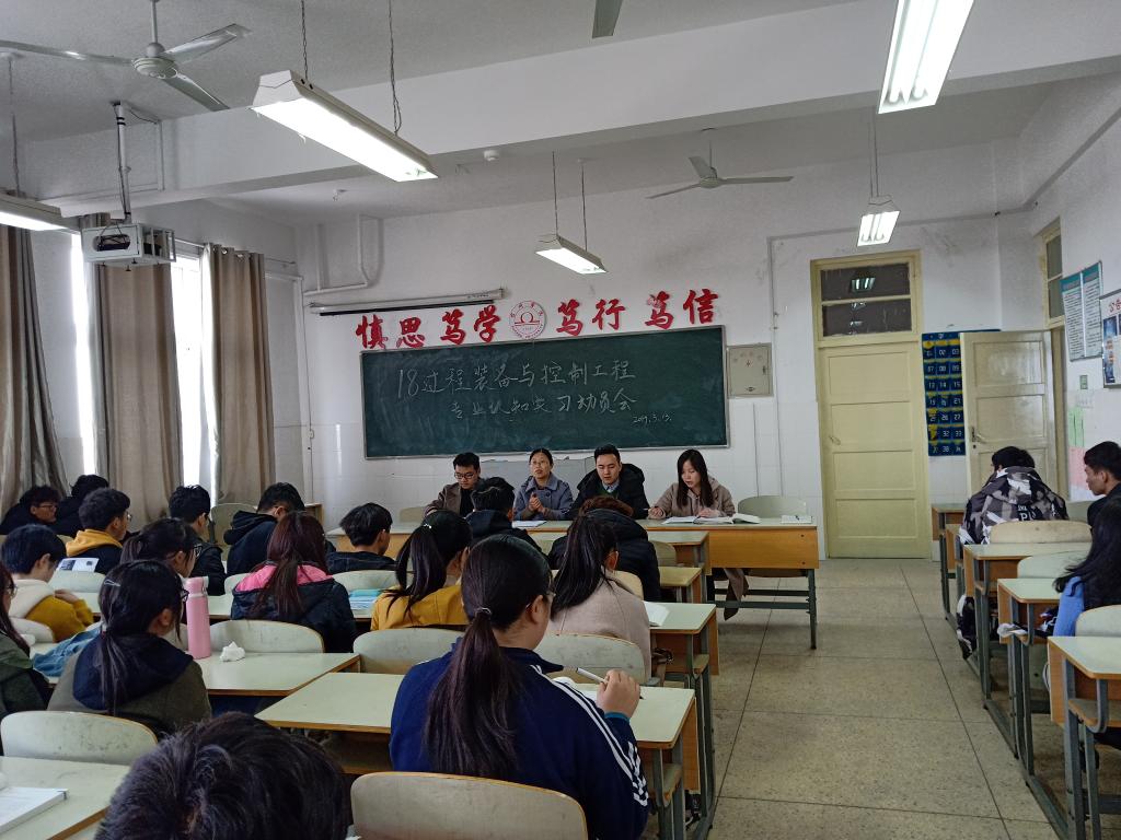 根据教学计划安排,按照16版人才培养方案,2018级过程装备与控制工程专业将于3月18日至3月22日进行为期5天的专业认知实习。03月13日上午午,实习动员大会在实验楼A410举行。教研室主任周丹红、指导教师郭攀老师、辅导员卞振涛、实验实训中心马尚尚及2018级过程装备与控制工程专业共计59名学生参加本次动员会。会议由学院实验实训中心主任秦苗主持。