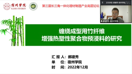 20221223-25第三届长三角一体化增材制造产业高层论坛于在安徽省芜湖市顺利举行,本次论坛由安徽工程大学、繁昌区人民政府主办,采用线上线下结合方式举办。我院郝建秀博士在论坛上作了题为“缠绕成型用竹纤维增强热塑性聚合物预浸料的研究”的学术报告。